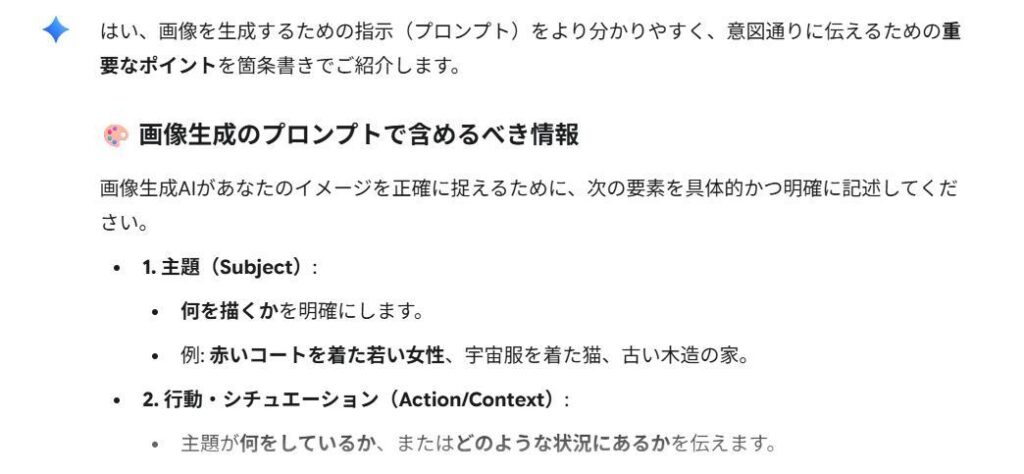 はい、画像を生成するための指示(プロンプト)をより分かりやすく、意図通りに伝えるための**重要なポイント**を箇条書きでご紹介します。