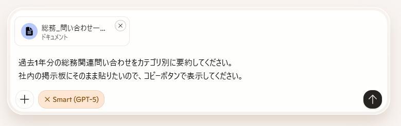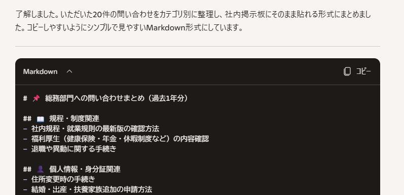 こうした問い合わせを効率的に整理・共有するために役立つのが 生成AIによる要約 です。 過去の問い合わせ内容をAIに整理させれば、カテゴリごとに分かりやすいFAQを短時間で作成でき、総務担当者の負担を大幅に軽減できます。