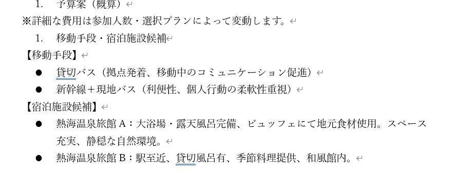 Wordの画面。社員旅行の企画書。リライトを下書きしている途中の画面。
